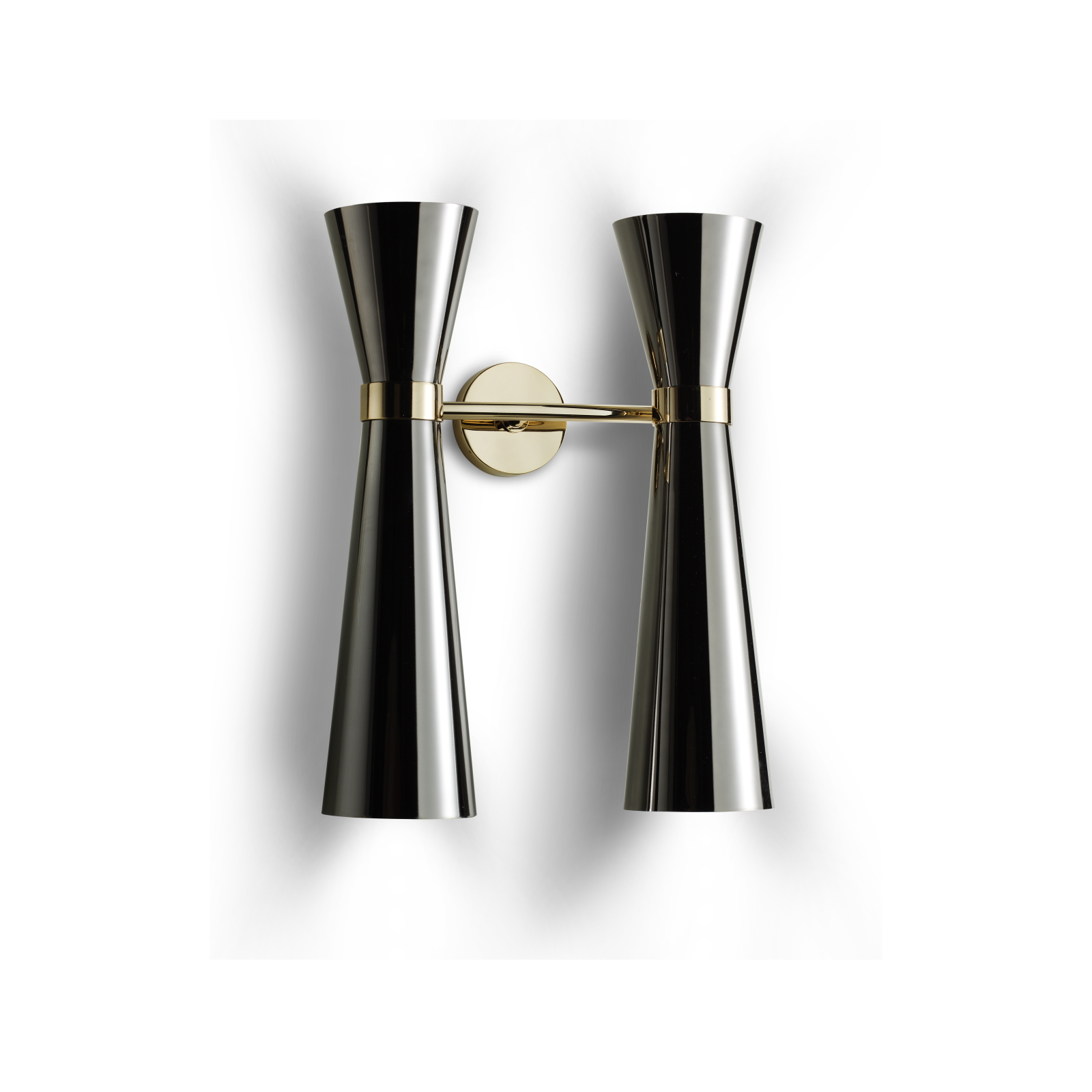 Composed of two metal structures in the fine black nickel finish, each consisting of two conjoined cones directed towards opposite directions, capable of giving light both in the upper and lower part. Base and arm in light gold finish. Available in various finishes.