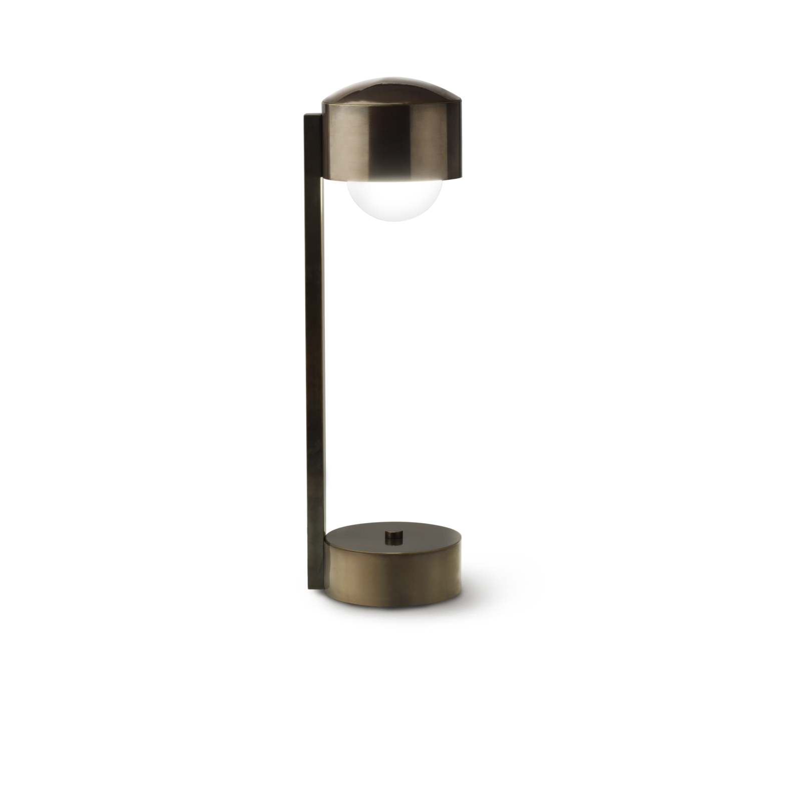 The structure of the lamp is made entirely of brass with a particular handmade bronze finish and completed by a glass sphere.