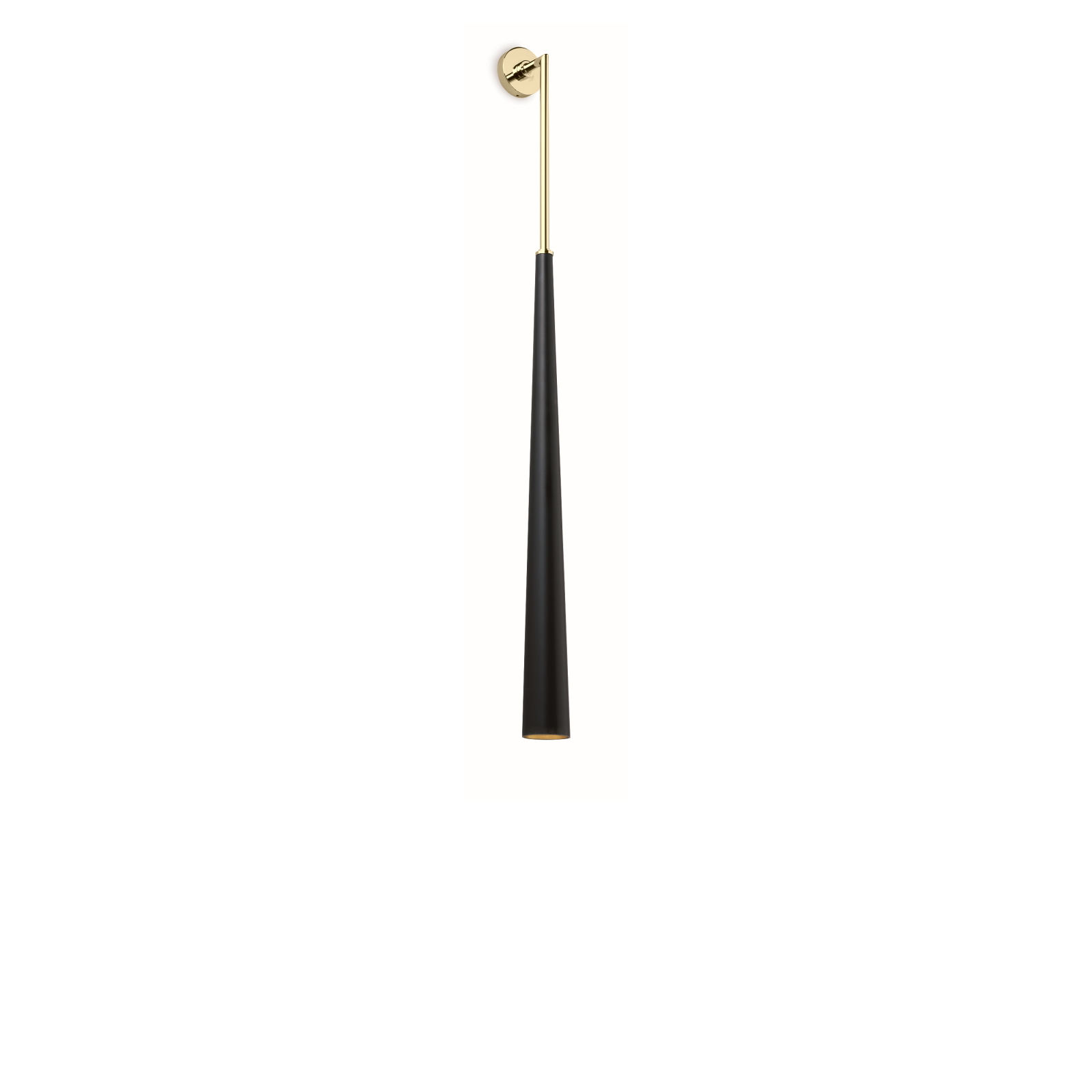 A vertical structure with an extremely elongated conical shape distinguishes this elegant wall lamp.
