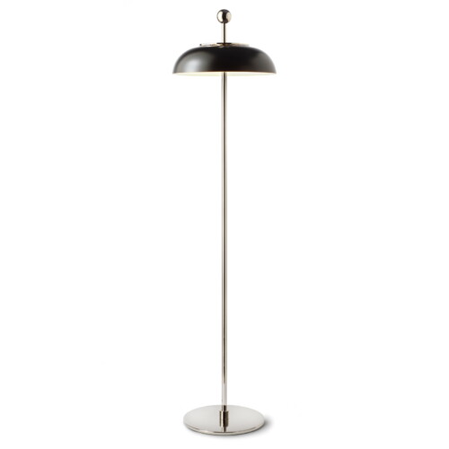 Circular base lamp with lampshade consisting of a two-tone painted metal cap. This polished nickel finish brass table light adds a touch of class to any decor, and a timeless aesthetic value. Available in various finishes.