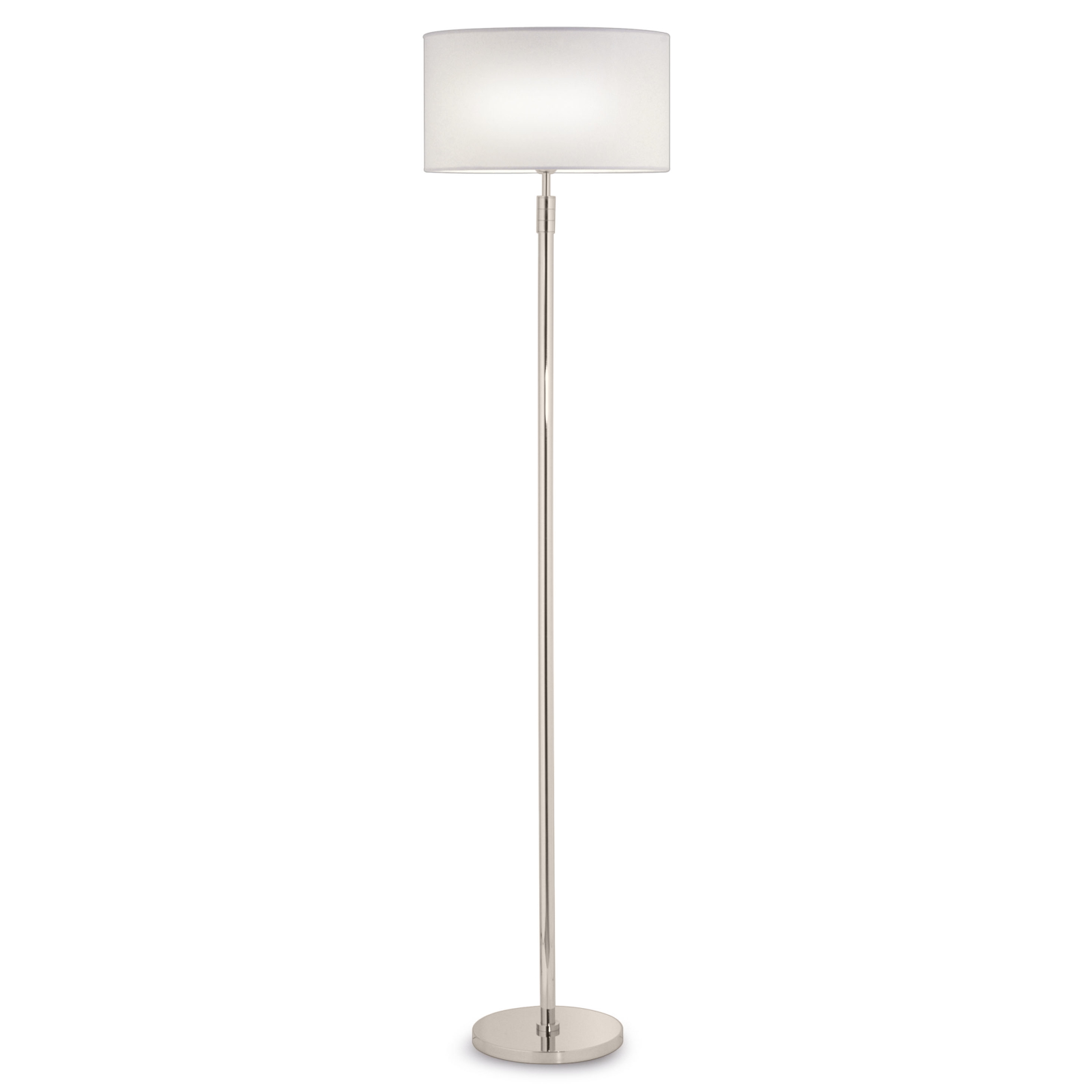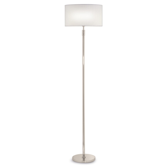 Floor lamp consisting of a round base, a linear body in polished nickel finish brass and upright a cylindrical lampshade in white fabric.