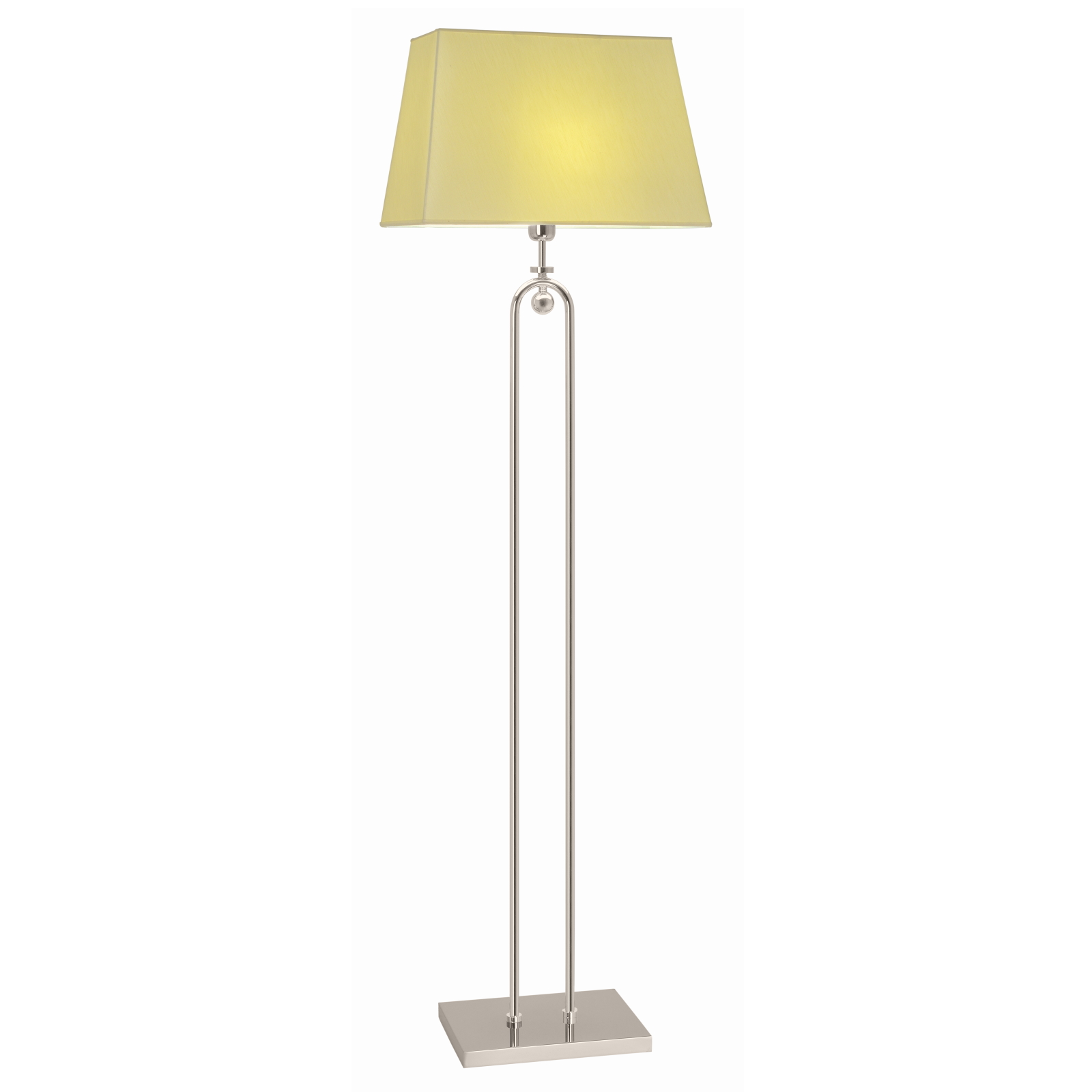 Consisting of a rectangular base from which rises a central body formed by two parallel rods which then join together, all made of metal in a chrome finish and completed by an ivory fabric lampshade.