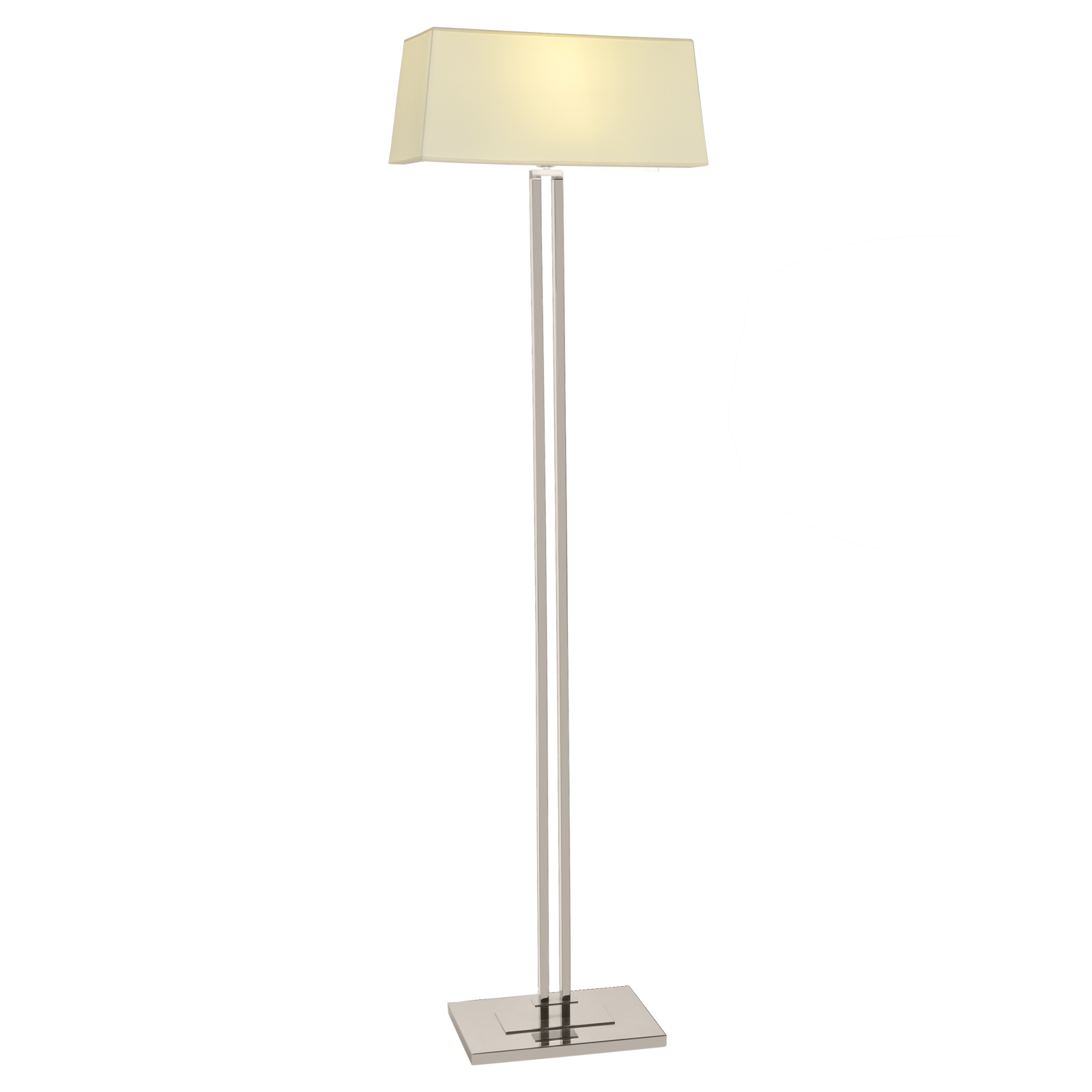 Consisting of a rectangular base from which rises a central body formed by two parallel rods, all made of metal in a chrome finish and completed by an ivory fabric lampshade.