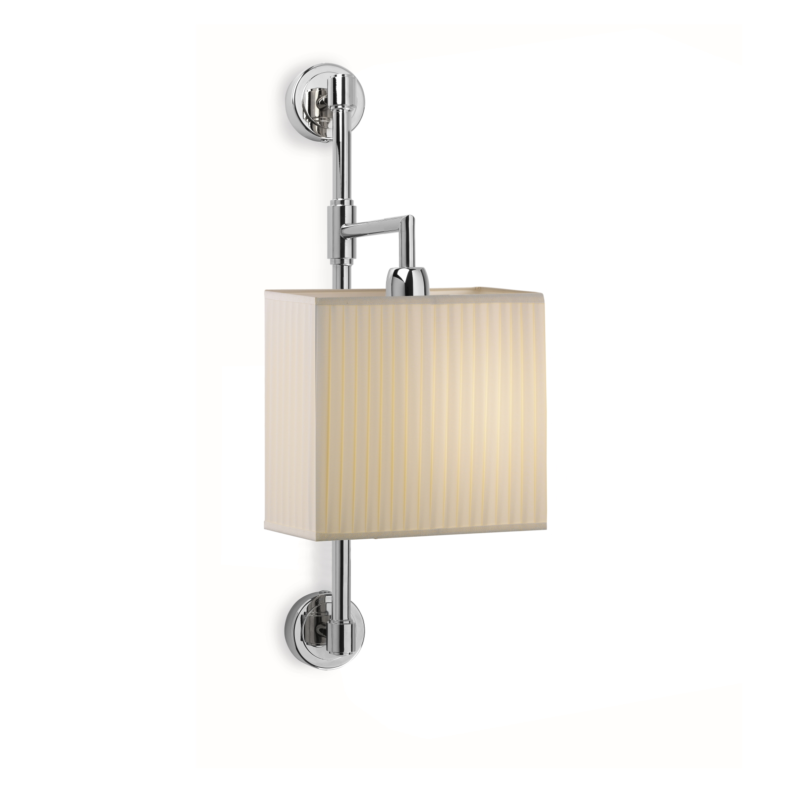 With a square geometric shape, this luminous body stands out for its symmetries and its aesthetics. The wall lamp consists of a vertical brass structure with a polished nickel finish and a rectangular lampshade in ivory pleated fabric.