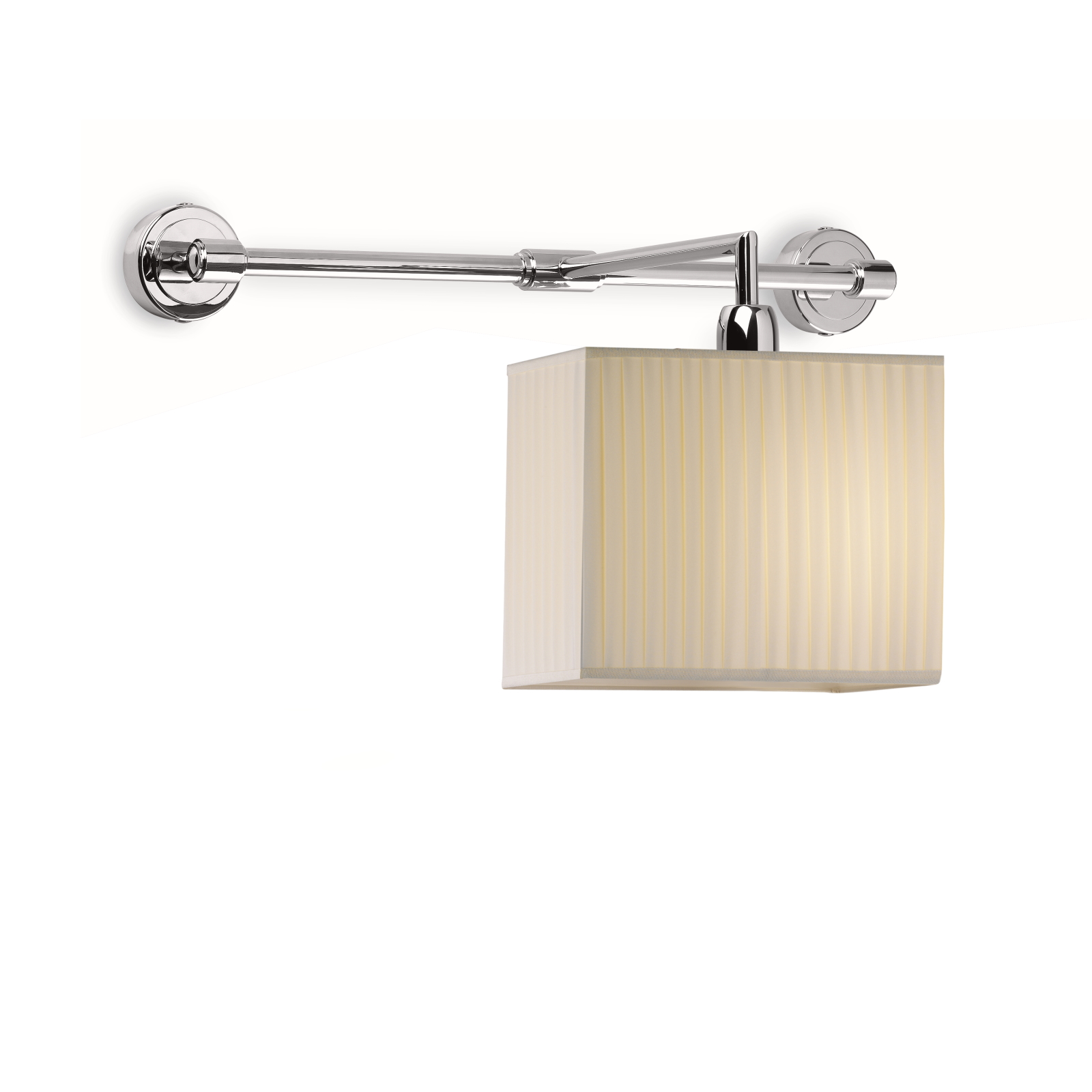 With a square geometric shape, this luminous body stands out for its symmetries and its aesthetics. The wall lamp consists of a horizontal brass structure with a polished nickel finish and a rectangular lampshade in ivory pleated fabric.